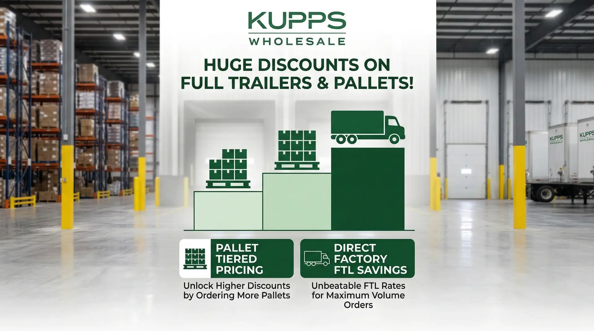 Price breaks for pallet-sized orders, Full Truck Load (FTL) deliveries, or shipping crates.